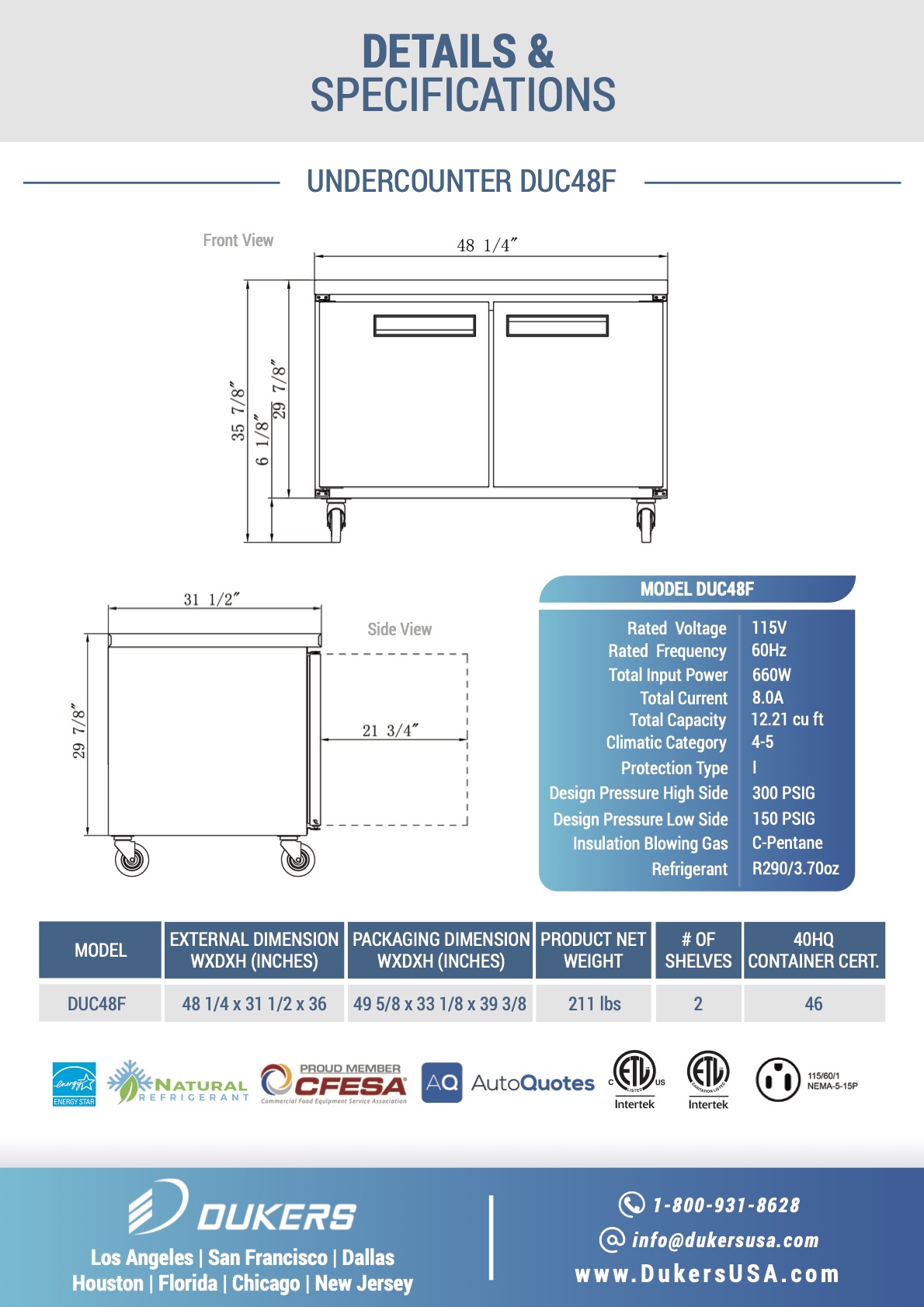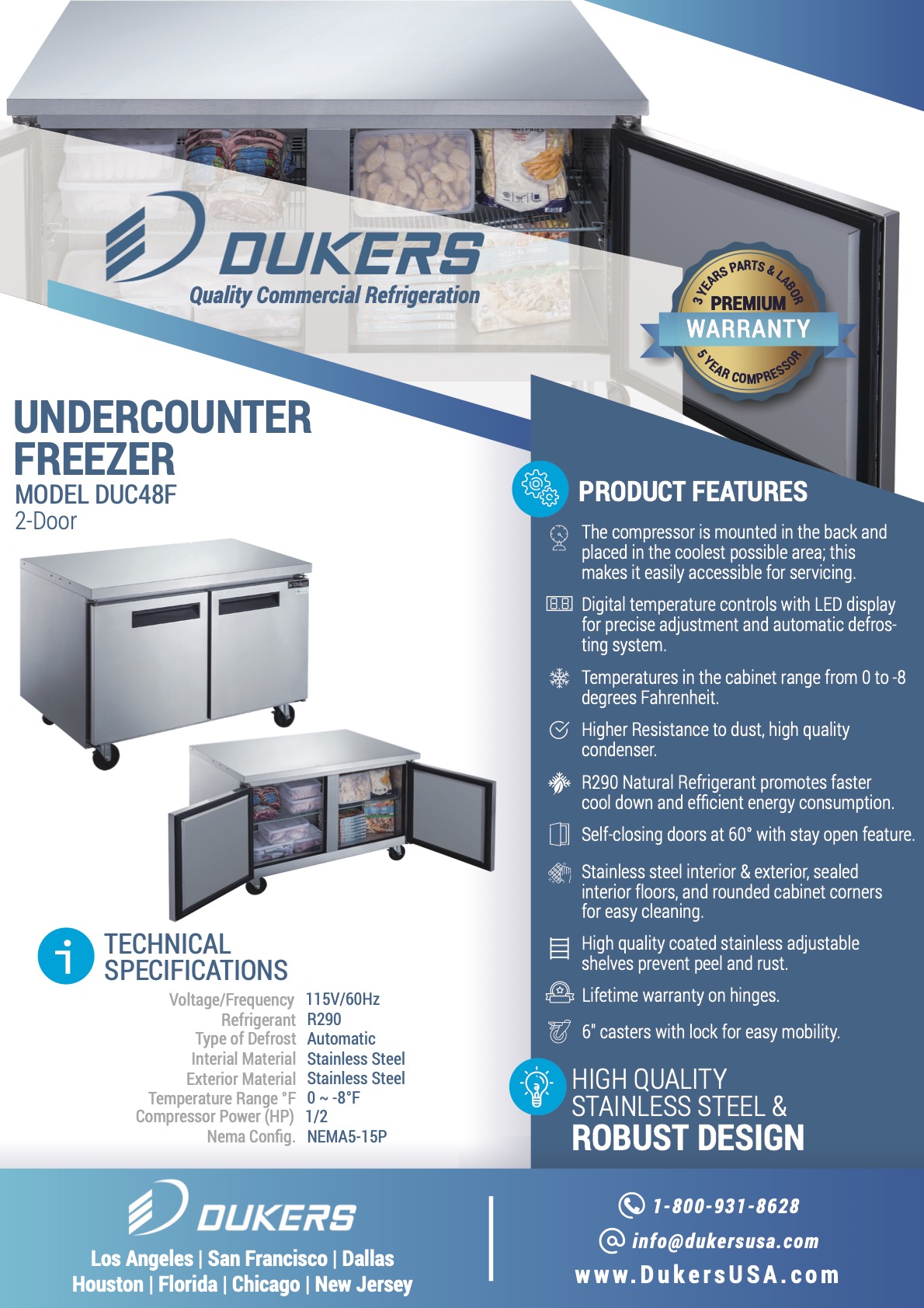The Dukers DUC48F undercounter freezer has a spacious capacity and all over brushed stainless steel construction. With a range of 0 to -8°F, it chills and safely stores all type of food to sub-zero temperatures. Digital temperature controls and LED display lets you precisely pick the desired temperature. Designed with a bottom mounted 1/2 HP compressor for efficiency. Includes 2 adjustable and removable wire shelves.